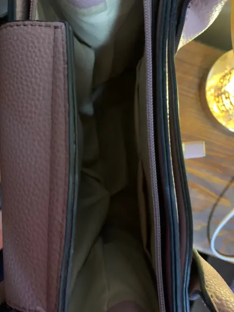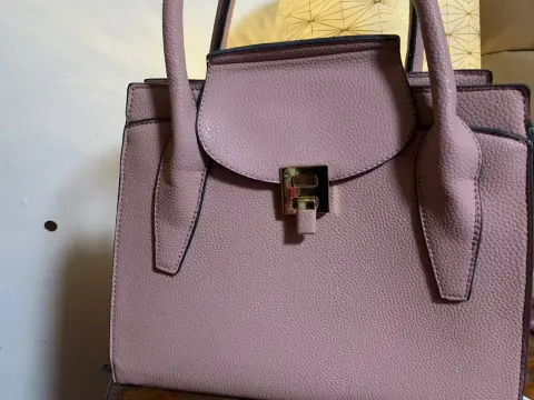 Bolsa tote. Bolsa tote, color rosa viejo, con seis compartimentos, de material vinil, juvenil y elegante