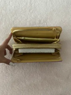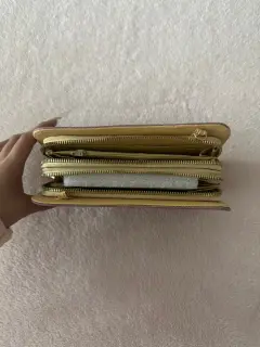 cartera súper amplia, útil para transportar el celular, algo de maquillaje, dinero, etc.Su interior es color dorado y trae una cadena dorada para convertirla en bolsa