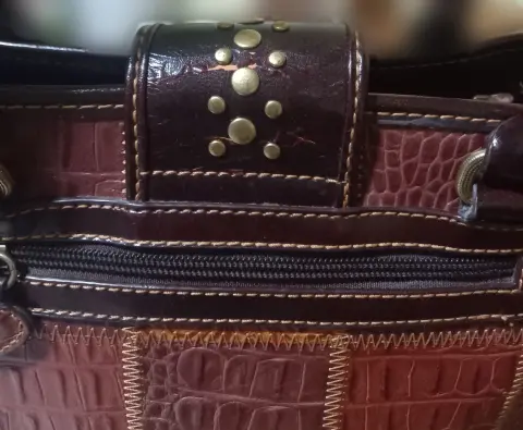 Bolsillos de cuero print. Hermoso bolso con detalles en print, poco uso solo se agrieto en la parte superior, en perfectas condiciones.