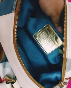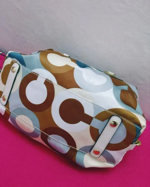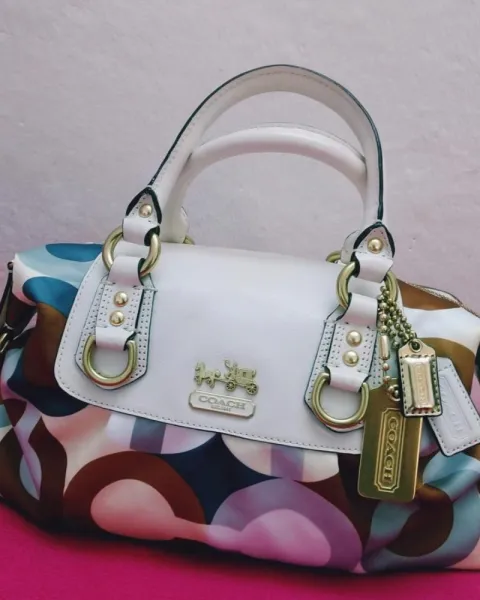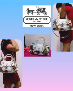 Bolso Coach Sabían satinada. Preciosa bolsa original Sabin de tela satinada color blanca, azul y café. Está padrísima y puedes tener dos modelos en uno. Detallitos poco perceptibles en última foto. Cuenta con sus tres llaveros y ID de autenticidad. Te regalo $100 en tu primer compra en shoppiland.com con el siguiente código: Lafemmelegant2BlwE9