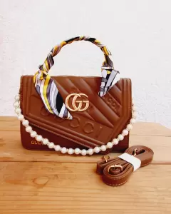 Bolso crossbodie inspiración Gucci, color kaki, cuenta con cadena de perlas y mascada como accesorio para colocar en el aza, incluye correa larga
