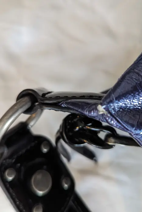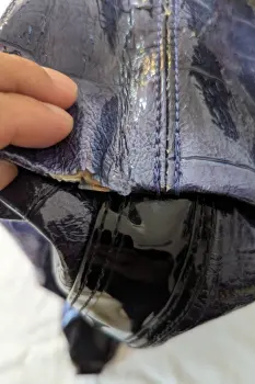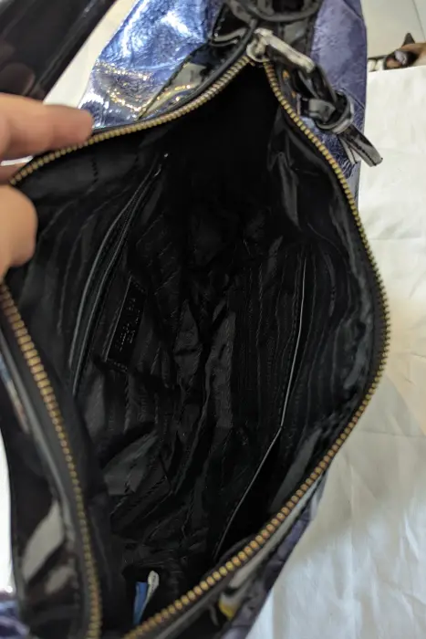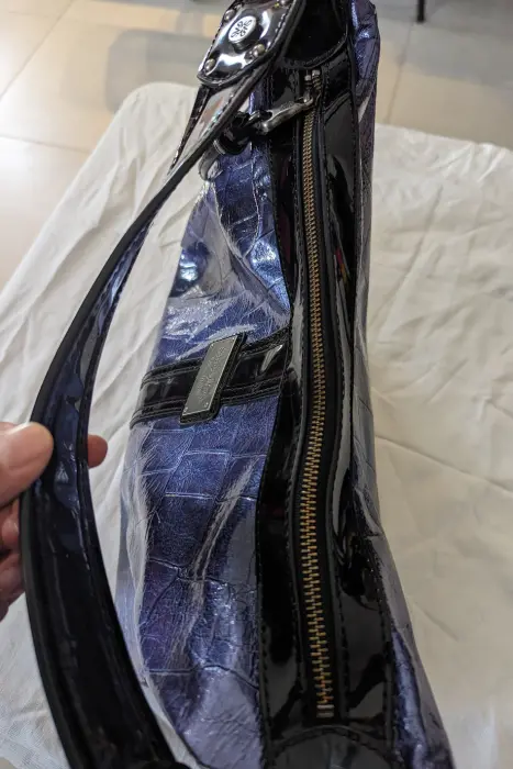 Tono púrpura metalizado con textura de cocodrilo. Con detalles en charol negro y placa dorada distintiva, este bolso es el toque final perfecto para cualquier conjunto. Versátil y con el tamaño ideal para llevar lo esencial, está lista para complementar tu estilo único.Muestra ligeros desgaste en una esquina inferior y al final de la agarradera.