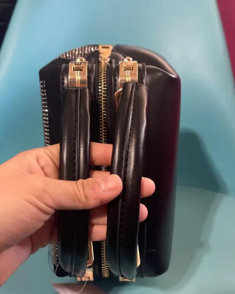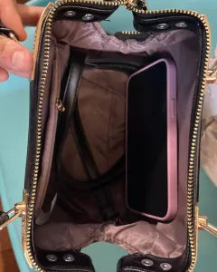 Divino bolso de mano con pedrería, incluye asa larga. Aún que parezca pequeño le cabe de todo ya que se despliega. Referencia de mi celular es un pro Max y aún le sobra espacio. Nuevo sin detalles