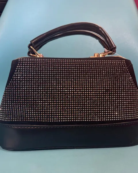 Bolso de fiesta. Divino bolso de mano con pedrería, incluye asa larga. Aún que parezca pequeño le cabe de todo ya que se despliega. Referencia de mi celular es un pro Max y aún le sobra espacio. Nuevo sin detalles