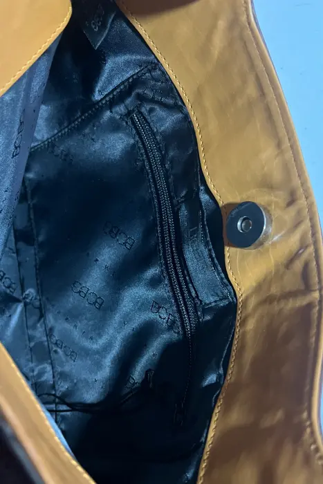 Bolso de mano BCBG MaxAzria con un elegante diseño geométrico de chevron con bandas en tonos de marrón y mostaza, perfecto para añadir un toque sofisticado a cualquier atuendo. Aunque muestra señales de uso que añaden carácter, la calidad del cuero y la artesanía se mantienen intactas.