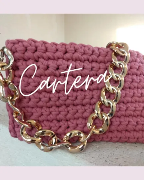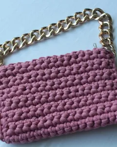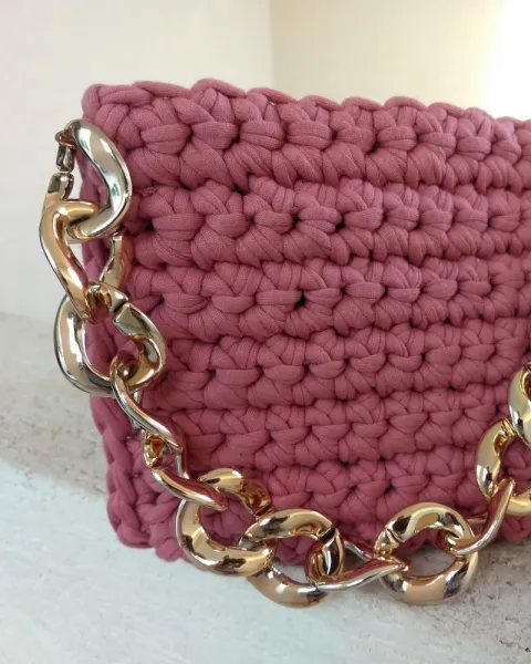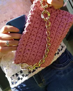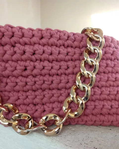 Bolso de mano en técnica crochet color rosa, cadena cilor dorado y forro con bolsa interna .Nueva