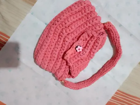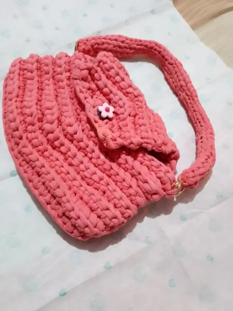 Bolsa de mano con botón de florecita, tejido a crochet con trapillo ligero, medidas 29x16x3 cmEnvio a la brevedadTodas las compras incluyen obsequioacepto ofertas