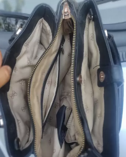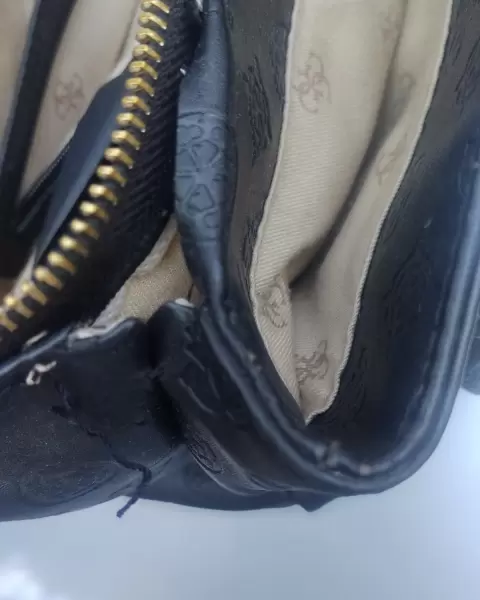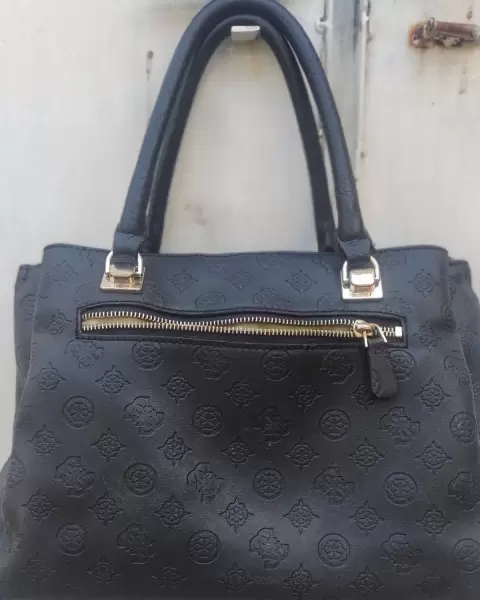 Bolso original Guess. Bonito bolso original chico color negro muy espaciosa, tiene detalles de uso las asas un poco raspadas o descarapelada y se descosido de un lado anexo fotos .
