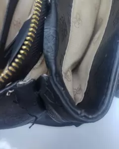 Bonito bolso original chico color negro muy espaciosa, tiene detalles de uso las asas un poco raspadas o descarapelada y se descosido de un lado anexo fotos .