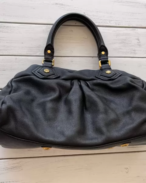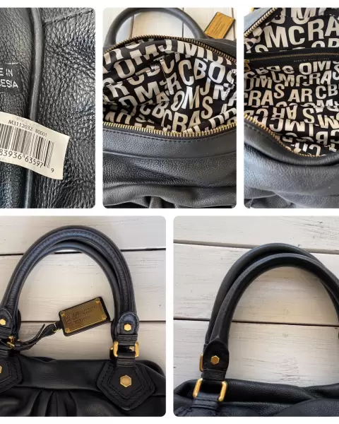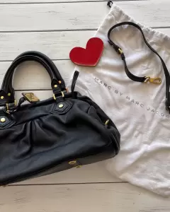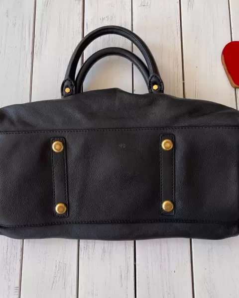 Bolso tipo bowler negro de piel Marc Jacobs. Bolso negro de mano o con correa para crossbody en piel con herrajes en color oro, por dentro 3 compartimentos: 2 sin cierre y 1 amplio con cierre, detalles de uso en la parte inferior en herrajes y piel, viene con cubrepolvo, medidas: alto 40 cm con asas y con correa 50 cm, ancho 15 cm y largo 40 cm