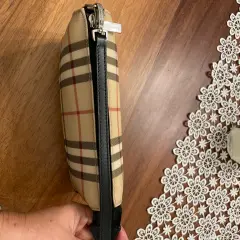 Burberry bolso pequeño. Bolsa original de mano pequeña, perfecto estado, de la marca Burberry en piel y lona. Herrajes grabados con el logotipo. Muy buen estado. MIDE 12.5cm largo por 23 cm ancho. Detalle en la esquina dos puntos de tinta.