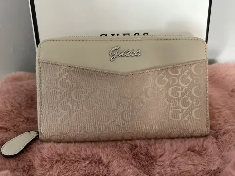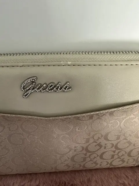 Clutch Guess. Bonito clutch Guess para fiesta, con el monogram G en la parte de enfrente y atrás, color como palo de rosa con beige, solo se usó dos veces, pero estuvo guardada, por eso tiene unos detalles de las últimas tres fotos
