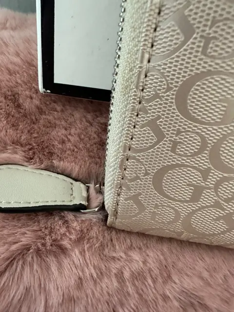 Bonito clutch Guess para fiesta, con el monogram G en la parte de enfrente y atrás, color como palo de rosa con beige, solo se usó dos veces, pero estuvo guardada, por eso tiene unos detalles de las últimas tres fotos