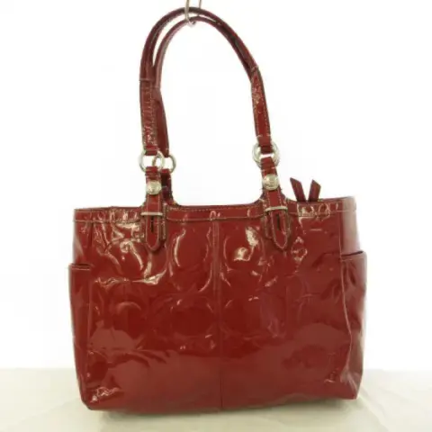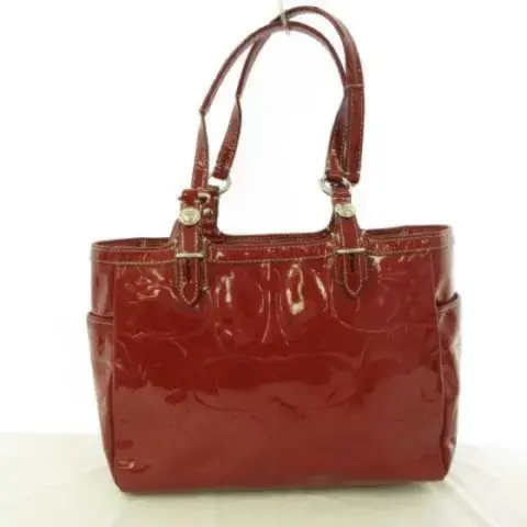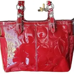 Bolso de hombro estilo satchel de charol grabado en rojo con el logo de Coach