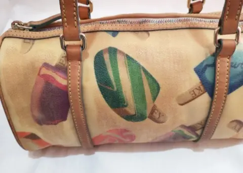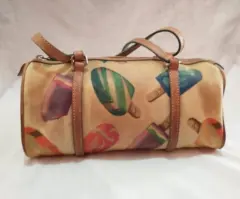 Divina bolsa de cuero super resistente, forma cilindrica,, bien conservada,, amplia, diseño con la forma de la marca multicolor