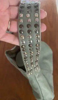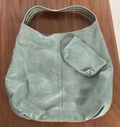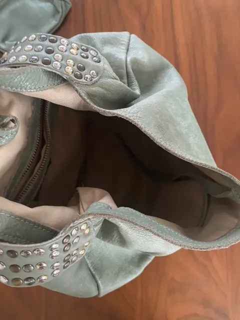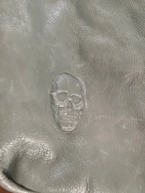 Excelente bolsa italiana color verde 100% piel, con aplicaciones en metal y distintivo de calavera. Viene con un monedero adicional.