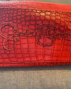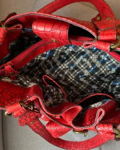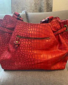 Preciosa bolsa de cuero en color rojo, trae grabado el logo de la marca en algunas partes, tiene una bolsita al frente muy coqueta, está impecable