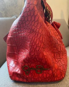 Linda bolsa Jessica Simpson. Preciosa bolsa de cuero en color rojo, trae grabado el logo de la marca en algunas partes, tiene una bolsita al frente muy coqueta, está impecable