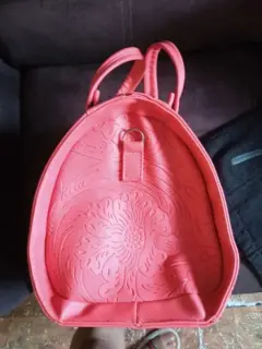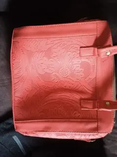Precioso bolso de mano color salmón, nueva, muy amplia, con hermoso diseño de grabado en el frente.