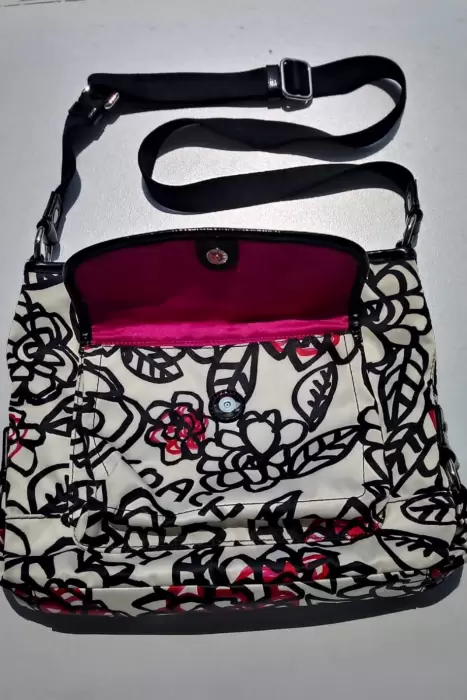 Bolsa bandolera Poppy floral graffiti, con bolsa externa en la parte de enfrente y la parte de atras, Correa para colgar ajustable, ligero desgaste de uso no muy visible en la parte inferior de abajo ( No afecta) detalle en ultima foto