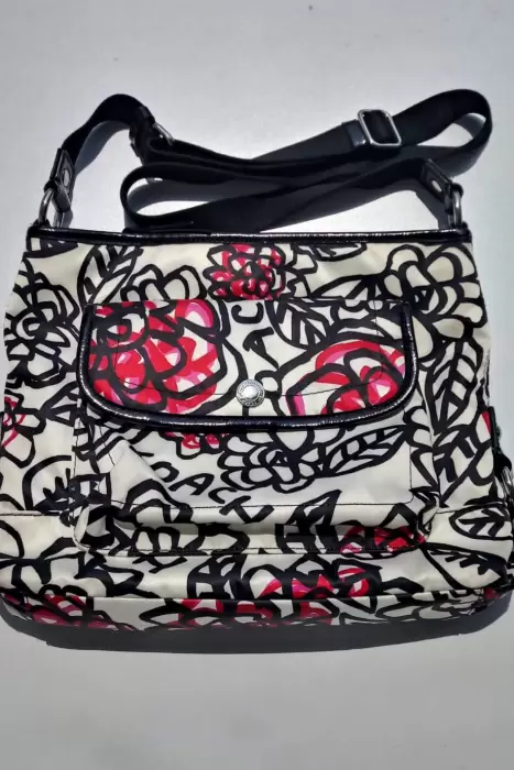 Bandolera Coach floral. Bolsa bandolera Poppy floral graffiti, con bolsa externa en la parte de enfrente y la parte de atras, Correa para colgar ajustable, ligero desgaste de uso no muy visible en la parte inferior de abajo ( No afecta) detalle en ultima foto