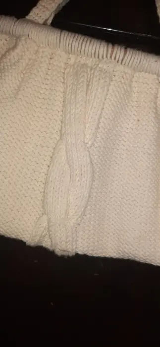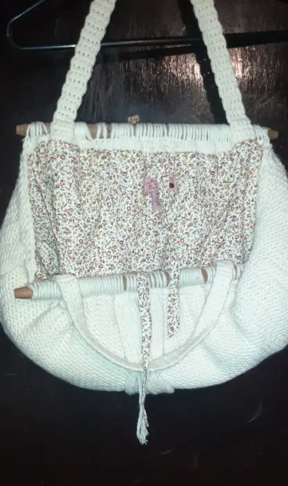 Linda bolsa a crochet con soporte de madera, forro de algodón intacto, blanca, muy amplia, con detalle de listón para cerrar la bolsa.