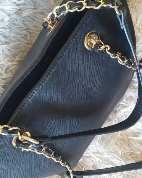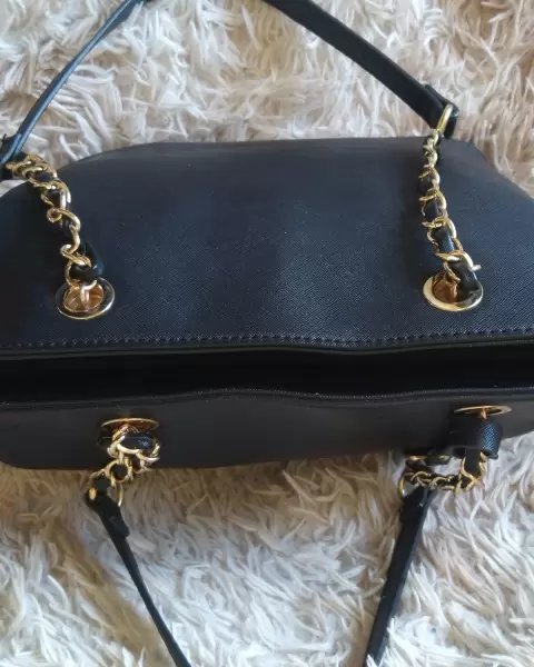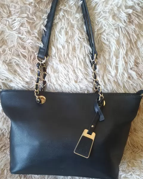 Bolsa Aldo Correa con Cadena. Hermosa bolsa Aldo original tamaño grande en color negro correa con cadena con detalles mínimos de uso tiene detalles de desgaste en la placa y en la esquina superior de la bolsa se peló un poquito pero es muy leve el detalle no se ve de lejos solo se me raspó con la pared un poquito. Mide 24 cm de alto por 40 cm de ancho. La bolsa está muy bonita prácticamente no tiene detalles está cómo se puede observar en las fotos.Puedo bajar el precio con pago Inmediato, Ayúdenos todas 🙌🏽🌸Ojo!! Grabó Video antes por seguridad de mi prenda, corroborando su estado 👁️👁️
