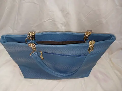 Bolsa azul de mano grande. Bolsa azul bastante amplia de muy poco uso en perfectas condiciones cabe un cuaderno profesional sin problema es de cierre, y cuenta con una bolsita interna y externa también con cierre