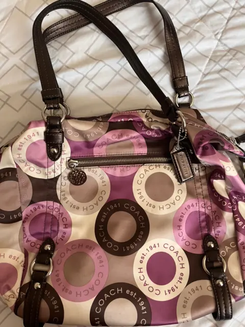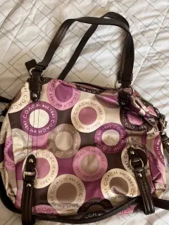 Bolsa original, usada, en excelentes condiciones, marca Coach, en color púrpura predominantemente.