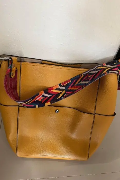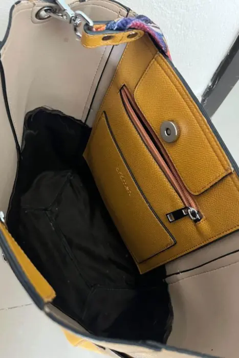 Hermosa bolsa color mostaza , super cuidada ,prácticamente como nueva.Es de gran capacidad con compartimientos tanto en el interior como a los costados del exterior de la bolsa.