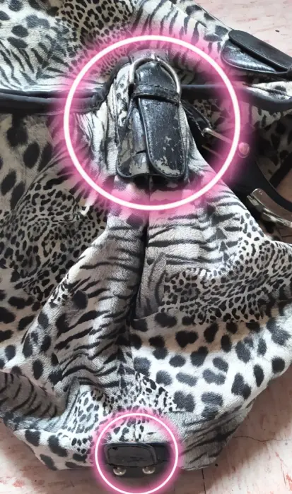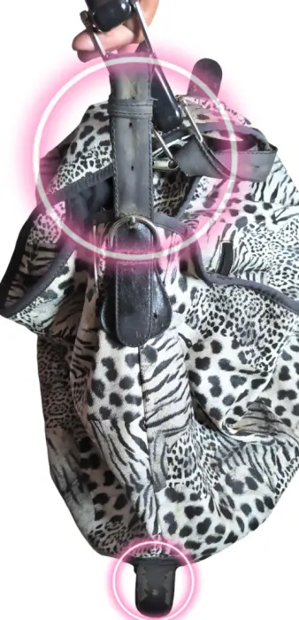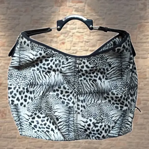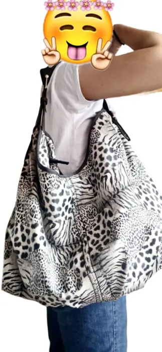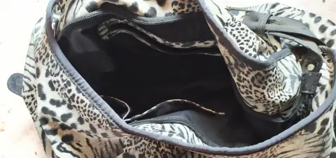 Bolsa de hombro grande con animal print, material sintético termoplástico, forro textil.Detalles: No sirve el cierre y tiene algunos desgastes en las asas que muestro en las dos últimas fotos, lo demás está en buen estado.Alto 38 cm.Ancho 55 cm.Fuelle 13 cm.
