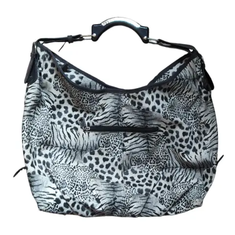 Bolsa de hombro grande con animal print. Bolsa de hombro grande con animal print, material sintético termoplástico, forro textil.Detalles: No sirve el cierre y tiene algunos desgastes en las asas que muestro en las dos últimas fotos, lo demás está en buen estado.Alto 38 cm.Ancho 55 cm.Fuelle 13 cm.