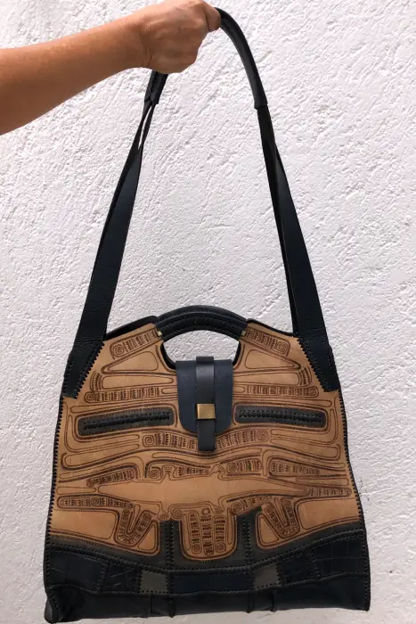 Bolsa de piel café con detalles negros. Contiene dos bolsillos en su interior.
