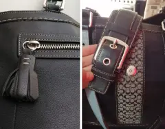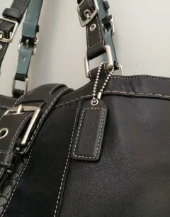 BOLSA GRANDE DE PIEL COACH. Hermosa bolsa de piel negra combinada con piel de diferentes texturas y MONOGRAMA de la marca en la parte de enfrente,,, hebilla decorativa, cierra con broche magnético, interior azul cielo, poco uso, bien cuidada