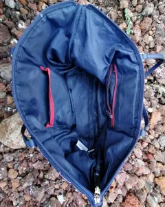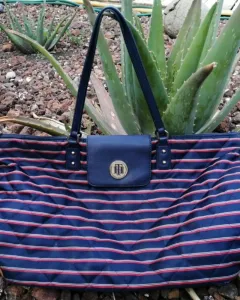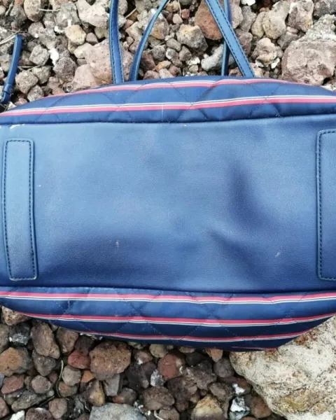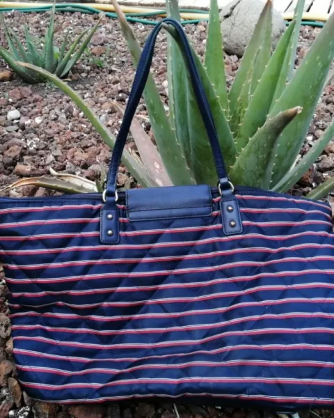 Bolsa casual de tela multicolor azul marino con rojo, placa metálica de la marca en color dorado.Medidas: 48cm de largo*27cm de ancho Ligeramente desgastada de la parte superior