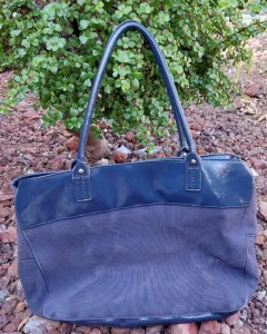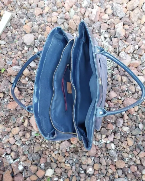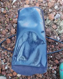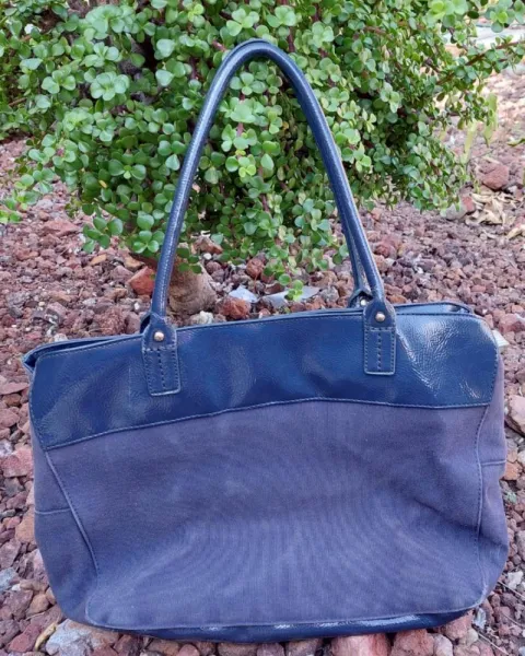 Bolsa azul marino de tela con charol.Sin desgaste en asas ni ennparte superior.Forro 100% textilExterior textil y charolMedidas 39cm de ancho * 30cm de largoDetalles:Tela exterior ligeramente desteñida