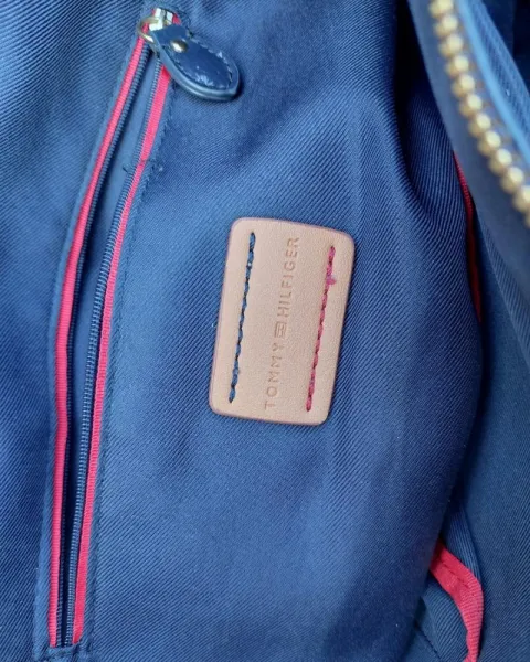 Bolsa grande TOMMY HILFIGER. Bolsa azul marino de tela con charol.Sin desgaste en asas ni ennparte superior.Forro 100% textilExterior textil y charolMedidas 39cm de ancho * 30cm de largoDetalles:Tela exterior ligeramente desteñida
