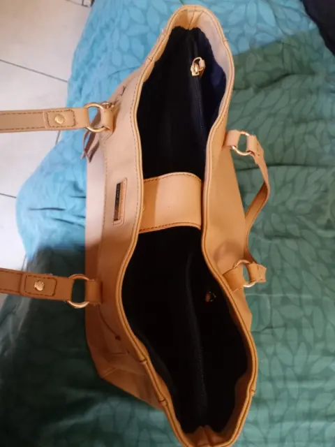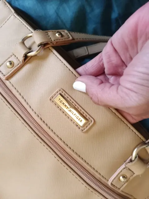 Bonita bolsa TH grande color beige mide 40 CM de ancho x 30cm de alto y 15 CM de ancho lateral le cabe bastante no tiene ningún detalle ni rotura solo el desgaste que se ve en las fotos tal cual 💞
