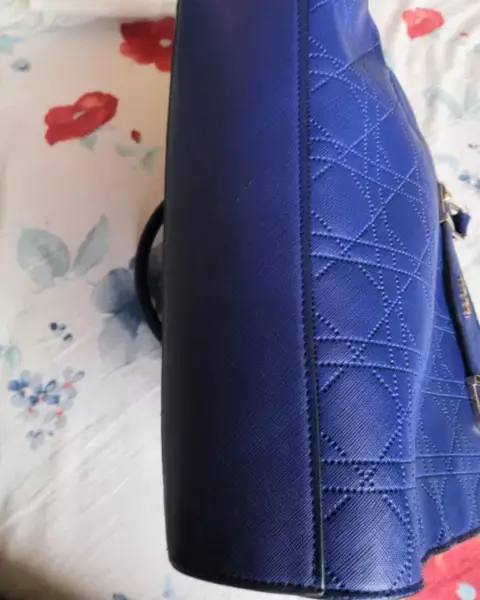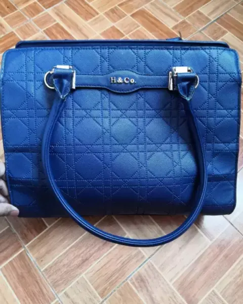 Bolsa marca H&co color azul rey, en excelente estado por dentro y por fuera, el detalle que tiene es que hay que reforzar las asas se aprecia en la última imagen, se aprecia en las imágenes que la bolsa se encuentra en buen estado.