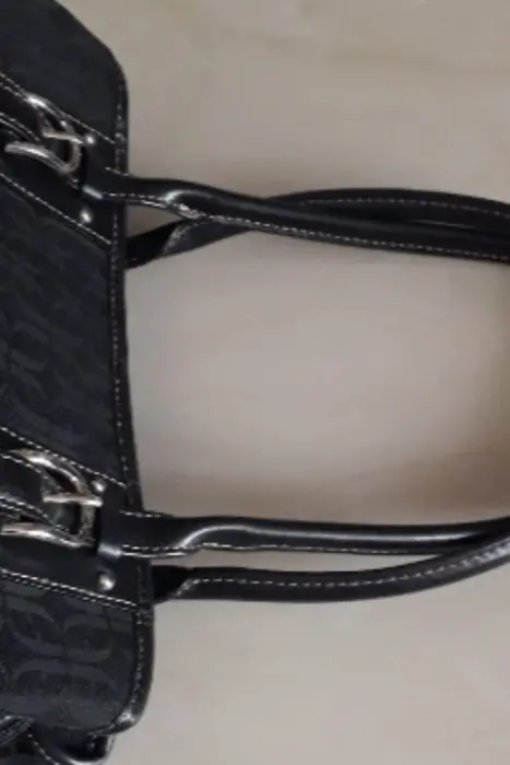 Bolsa negra Fossil, piel con tela, tamaño mediano, espaciosa, envio en caja reciclada