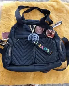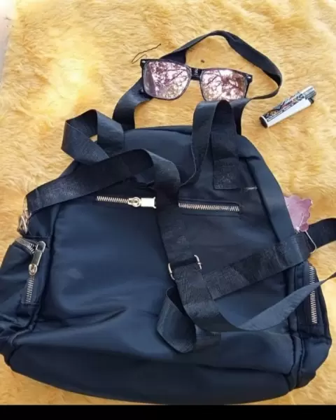 Hermosa mochila y bolsa negra con bolsitas a los costados enfrente , atras todos con cierre.amplia suave practica.