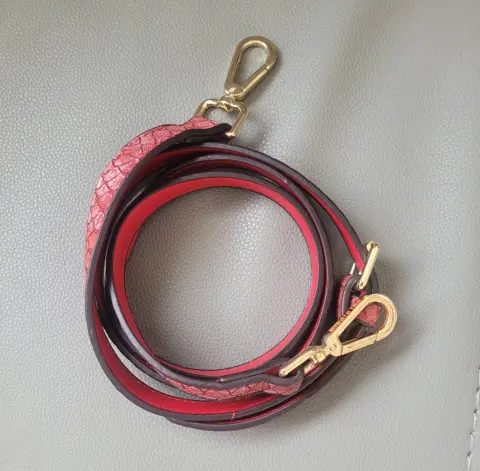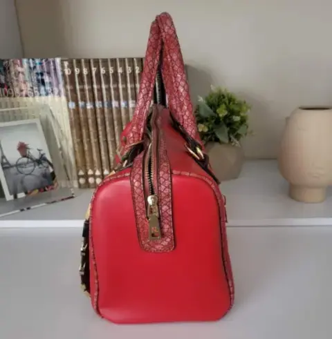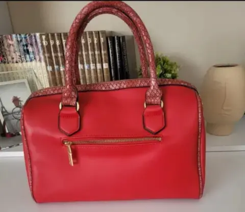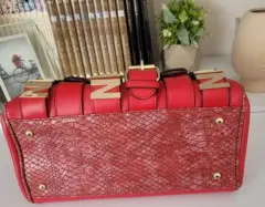 Elegante bolsa en color rojo con Herrajes dorados, contine asa de mano y correa de hombro Medidas: largo 32, alto 20, base 13