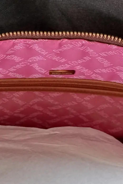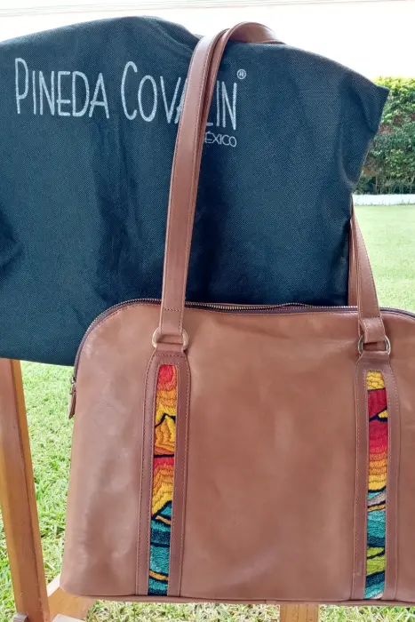 Bolsa Marca Pineda Covalin, color cafe, bordado en buen estado, con cubrepolvo.