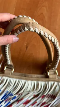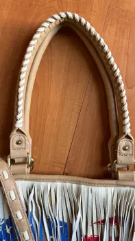 Bolsa Steve Madden de flecos. Bolsa tote Steve Madden de flecos con la bandera de Estados Unidos tamaño grande con doble asa , para usar como tote y como crossbody, usada muy poco pero tiene un imperfecto en un asa de estar colgada, fuera de eso está en súper buen estado de todo lo demás.