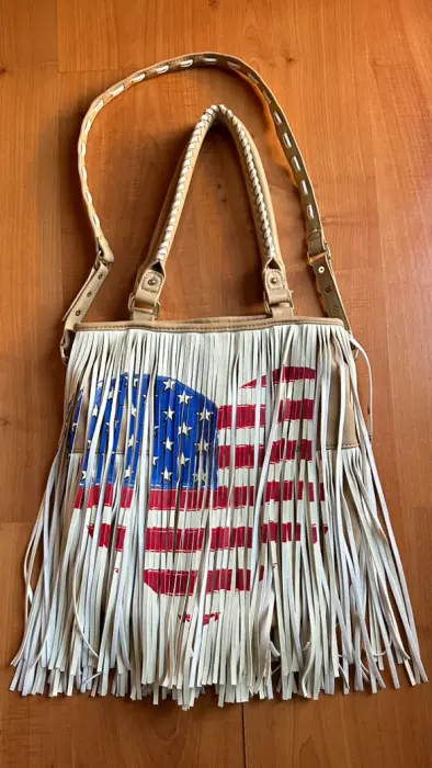 Bolsa tote Steve Madden de flecos con la bandera de Estados Unidos tamaño grande con doble asa , para usar como tote y como crossbody, usada muy poco pero tiene un imperfecto en un asa de estar colgada, fuera de eso está en súper buen estado de todo lo demás.