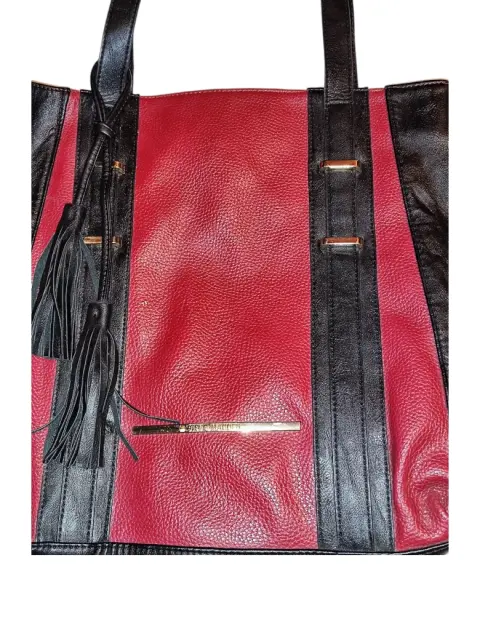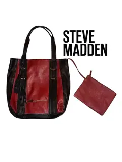 Bolsa Steve Madden vino con negro. Bolsa Steve madden en color vino con negro trae un forro por dentro blanco con negro un monedero o cosmetiquera extra .el único detalle que tiene es que está un poco descarapelado de una partecita pero casi no se percibe hay foto de ese detalle.
