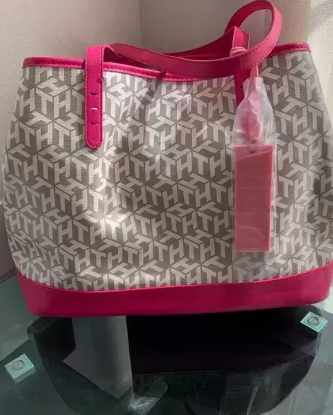 Bellísima bolsa Tommy Hilfiger color rosa con dorado, con un diseño de la marca TH color beige, es amplia no cuenta con cierre por fuera. 100% original importada 🇺🇸🇺🇸 totalmente nueva