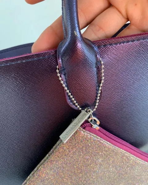 Hermoso bolso con pochette, tiene cierre. Nueva con ligeros detalles que muestro en fotos, interior color morado.