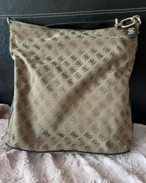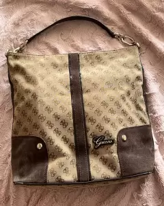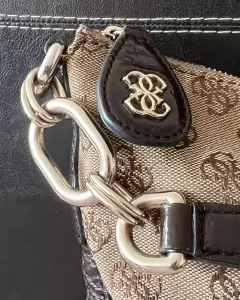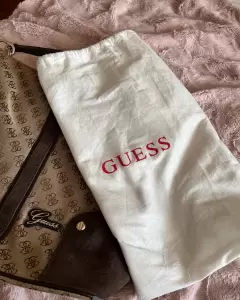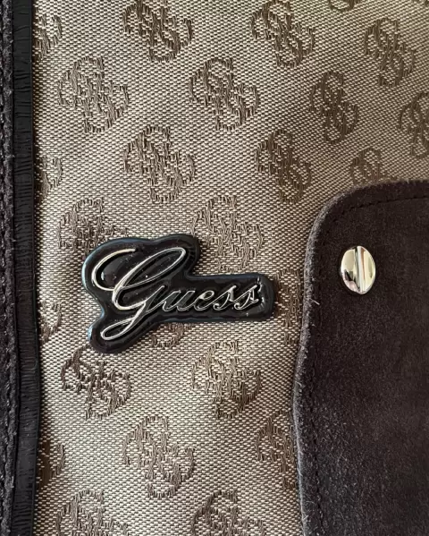 Bolsa grande café con holograma de la marca Guess. Es de tela y tiene una tira de terciopelo en un tono más cafe. La correa es corta adornada con una cadena