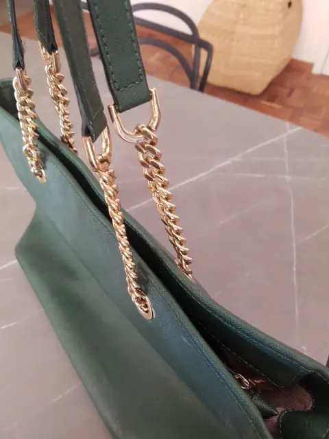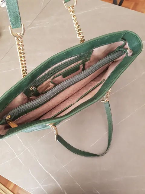Bolsa verde super amplia, con asas de cadena, tiene muchos compartimentos, muy elegante, cuenta con un detalle en una de las asas que se muestra en una de las fotos